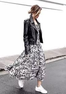 2. 正式场合:皮衣搭配连衣裙和高跟鞋,展现女性的优雅气质。